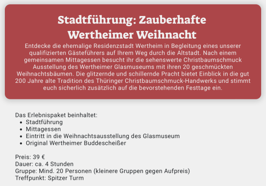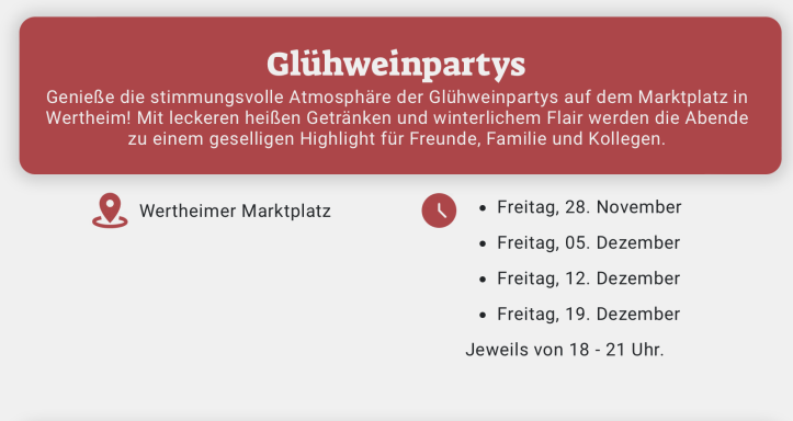 Besuchen Sie uns bei JustFood auf dem Wertheim Weihnachtsmarkt, wo wir Ihnen eine Auswahl an leckeren, regionalen Spezialitäten präsentieren. Lassen Sie sich von aufmerksamen Mitarbeitern verwöhnen und genießen Sie die beste lokale Küche, während Sie sich von der festlichen Atmosphäre inspirieren lassen. Wir freuen uns darauf, Sie bei uns willkommen zu heißen!