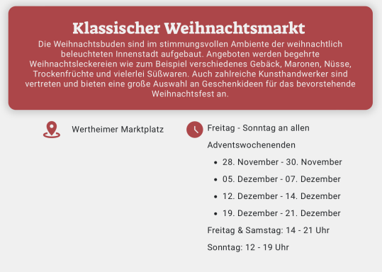 Der Weihnachtsmarkt hat eine lange Tradition und ist ein wichtiger Bestandteil der regionalen Kultur in Wertheim. Jedes Jahr zieht der Markt zahlreiche Besucher an, die die historischen Stände erkunden und sich von den festlichen Angeboten inspirieren lassen. Die Verbindung von Geschichte und modernen Elementen schafft eine einmalige Atmosphäre, die Besucher in ihren Bann zieht.