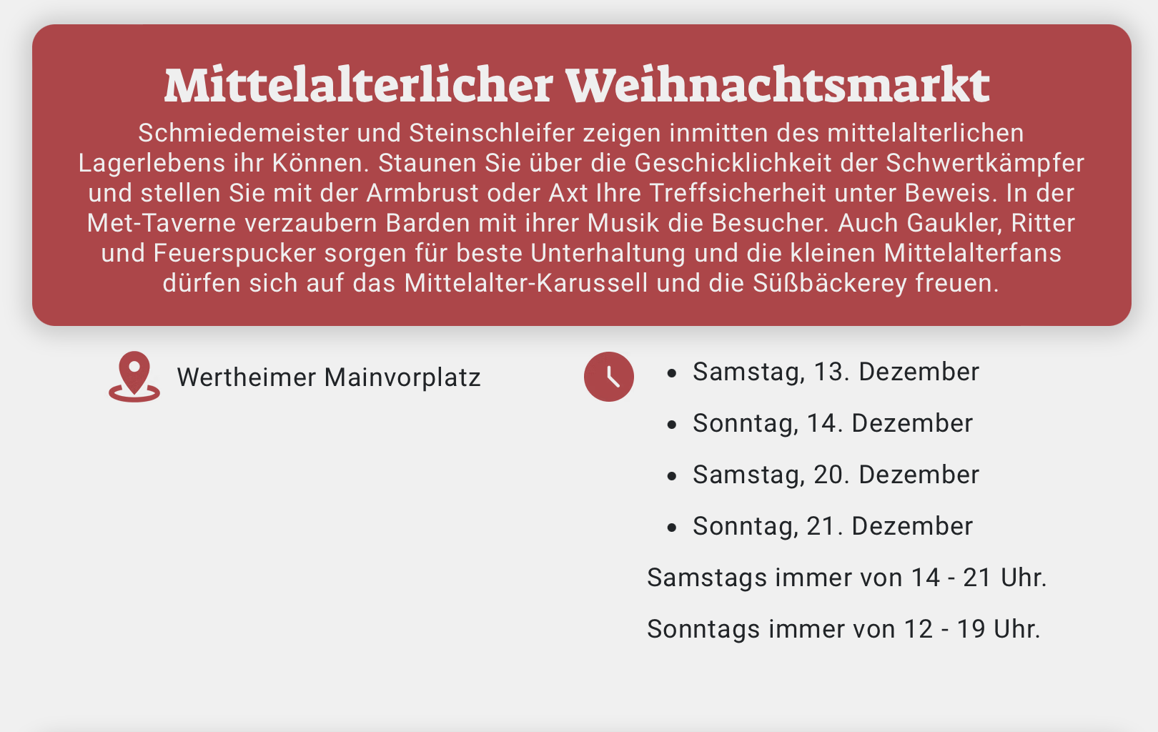 Der Weihnachtsmarkt ist ein beliebtes Ziel für Familien und Freunde. Neben den wunderbaren Essensständen gibt es zahlreiche Attraktionen für die Kleinen, darunter Karussells und kreative Bastelworkshops. Der Markt bietet eine einladende Atmosphäre, die es allen Altersgruppen ermöglicht, die Feiertage zu genießen und schöne Erinnerungen zu schaffen.